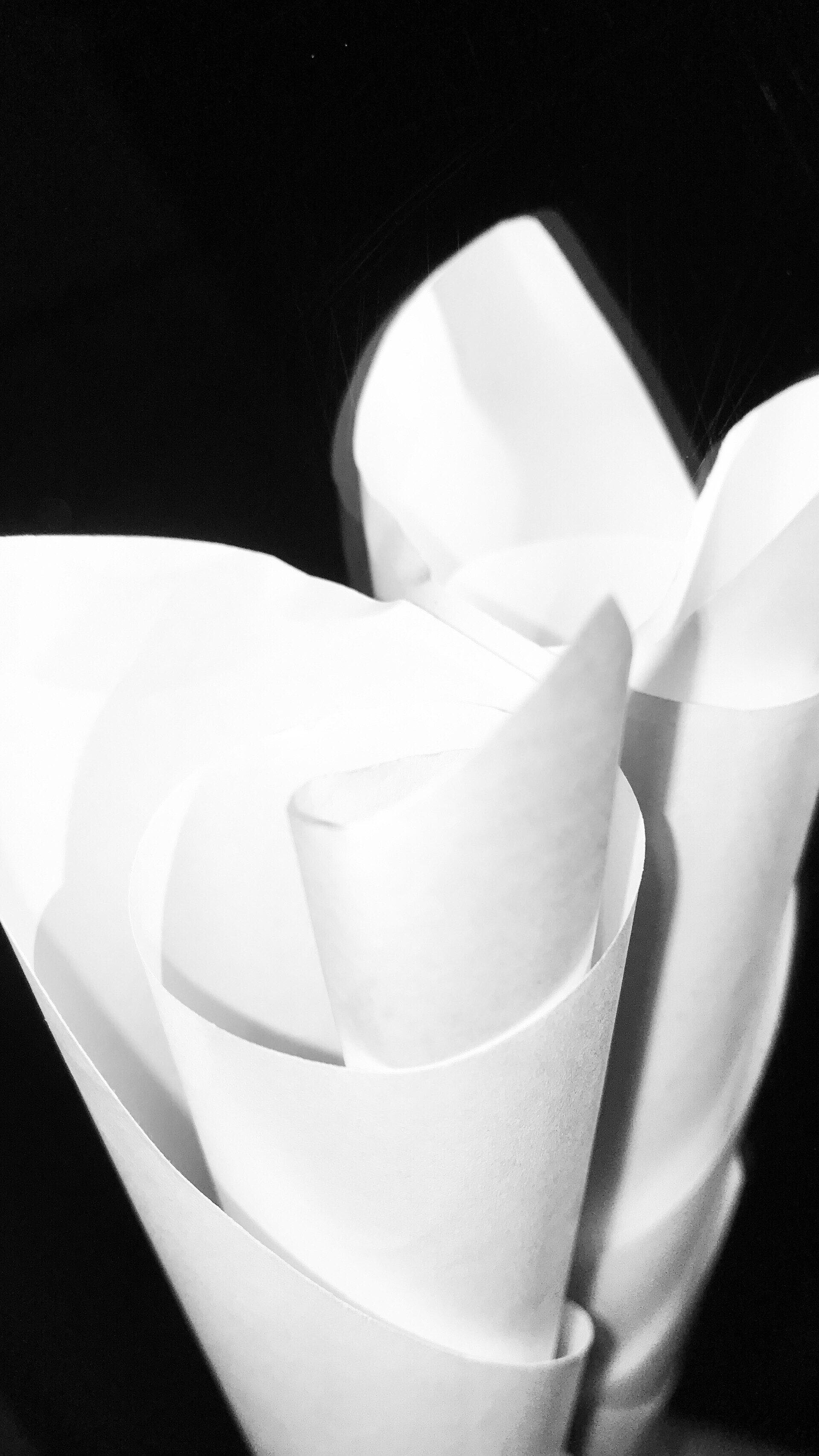 Gostei bastante dos diferentes níveis de sombra, criando os tons acinzentados, então não ficou somente no conceito de preto e branco, porque foram bem trabalhadas. A luz clara sobre o próprio papel dobrado deu um efeito de cor levemente lilás no centro, então achei bem legal. Gostei do enquadramento também, ficou bem centralizado. Porém, acho que poderia melhorar no quesito de textura, pois o papel ficou muito em evidência, revelando de cara o objeto. Acredito que fazendo dobras um pouco menos marcadas e/ou cortando a imagem para focar mais no meio, já ajudaria a disfarça-lo e melhoraria ainda mais, para chegar no exato tema proposto.